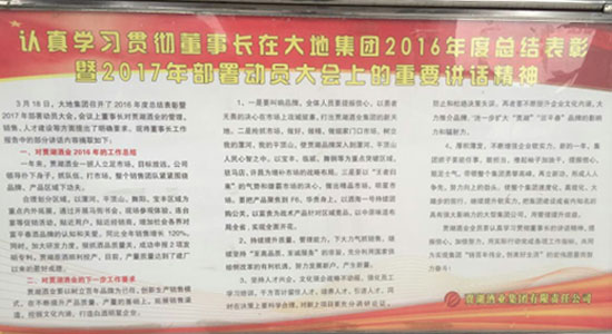 務求實效”的宗旨,各單位結合自身實際,通過座談會,研討會,專題會等方式,學習傳達董事長講話精神,吃透實質,找準亮點,讓全體員工了熟知新精神,新要求,新目標,新措施,真正把廣大干部職工的思想統一到講話精神上來,更好地落實到實際工作中去, 增強廣大員工的憂患意識、危機意識、責任意識和擔當意識,為完成全年各項工作任務而不懈努力! 大地公司: 為更好的貫徹落實集團公司2016年年會精神。大地公司結合自身實際,采取專題宣講、座談討論的方式,分層次、分批次、分部門全面開展學習3·18董事長講話精神,連續多次組織職工學習探討。針對新一年的工作目標和要求,大地公司總經理趙中要要求,全體員工要對照自身職責,全面領會講話實質,緊密聯系工作實際,圍繞集團整體的發展方針與工作要求,結合年初制定的各項工作目標與經濟指標,采取強有力的措施,強化時間觀念和效率意識,圓滿完成全年的各項工作任務。 會上,廣大干部職工紛紛表示,要以此次會議為契機,擼起袖子加油干,力爭在使各項工作再上新臺階,提升新高度。 賈湖酒業: 3月19日上午,賈湖酒業集團召開中高層領導會議,布置落實學習董事長3·18講話精神活動。集團常務副總孫耀州要求,集團上下要認真學習和落實董事長講話精神,并融入到日常工作中去,以更加昂揚的斗志去迎接新的挑戰。一是要加大宣傳力度,營造濃厚氛圍。利用報刊、宣傳欄、微信平臺等手段宣傳講話精神,使其融入到每個員工的心中;二是各部門要制定詳細的學習計劃。分步驟、分時間、分批次通過不同的形式進行學習,深刻體會講話精髓;三是要加強監督落實。成立專門的督查小組,對各部門學習情況進行督查,對學習成果進行抽查,最終達到預定的學習目的。 會后,各部門積極響應,迅速行動,第一時間召開座談會,研討會等不同形式的活動,整個集團上下形成了深厚的學習氛圍。 集團行政部: 3月23日下午,行政部組織全體辦公室人員在中控二樓接待室召開討論會。辦公室副主任黃帥輝首先傳達了董事長講話精神,進一步分析了講話的重點和亮點,結合自身工作實際,參會人員展開激烈討論,剖析自身存在的問題和不足。特別是董事長對當前面臨的嚴峻形勢與發展機遇的精準分析,以及對今年工作提出先進的發展理念、明確的戰略目標、清晰的發展方向,令人精神振奮,備受鼓舞,大家紛紛表示,要提振士氣,鼓足干勁,轉變工作作風,提高辦事效率,更好地發揮參謀助手、綜合協調、督辦督查、服務保障四大職能,努力做到滿負荷,快節奏,優質高效地為集團發展壯大作出積極貢獻。