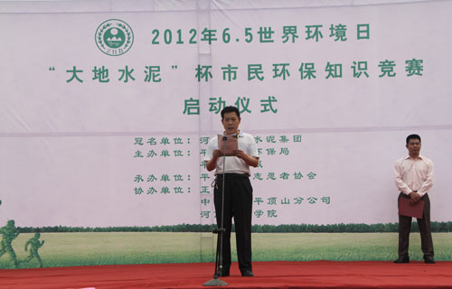 2012年6月5日,由河南省大地水泥集團冠名,平頂山市環保局、平頂山晚報主辦的2012年6.5世界環境日“大地水泥”杯市民環保知識競賽啟動儀式在市鷹城廣場舉行,平頂山市志愿者協會、河南城建學院等單位及廣大市民共500多人參加了儀式。 大地集團辦公室主任閆中安代表企業發表了“倡導綠色消費 保護生態環境”的倡議書,呼吁廣大市民提倡“綠色消費”的生產和生活方式,爭做“綠色消費”的發動者和實施者……。并宣布2012年6.5世界環境日“大地水泥”杯市民環保知識競賽啟動儀式正式開始。